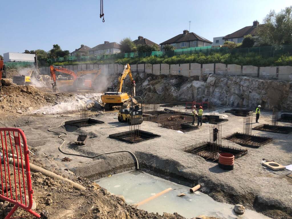 Construction works are ongoing at this residential site at Barnhill, Dalkey Co. Dublin. Significant rock excavation is ongoing with the Kingpost retaining wall system now installed and foundation construction has commenced.