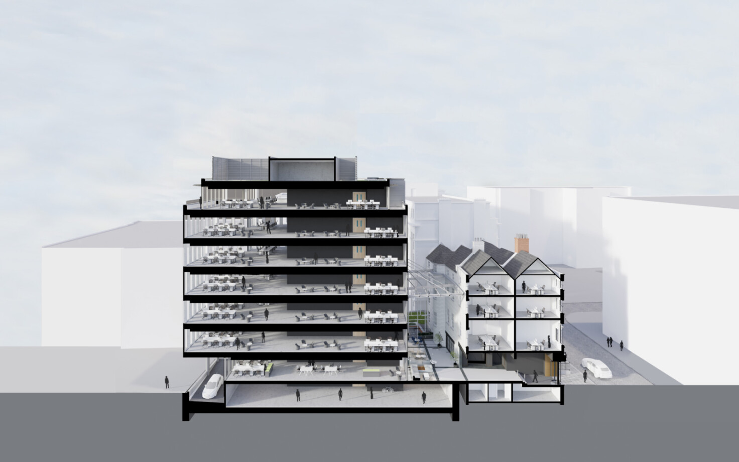 The site was an extremely tight inner-city location with a narrow access off School House Lane. From the start of the design process access and deliveries of construction materials needed to be considered, and early engagement with the contractor helped develop a design suitable for the site.