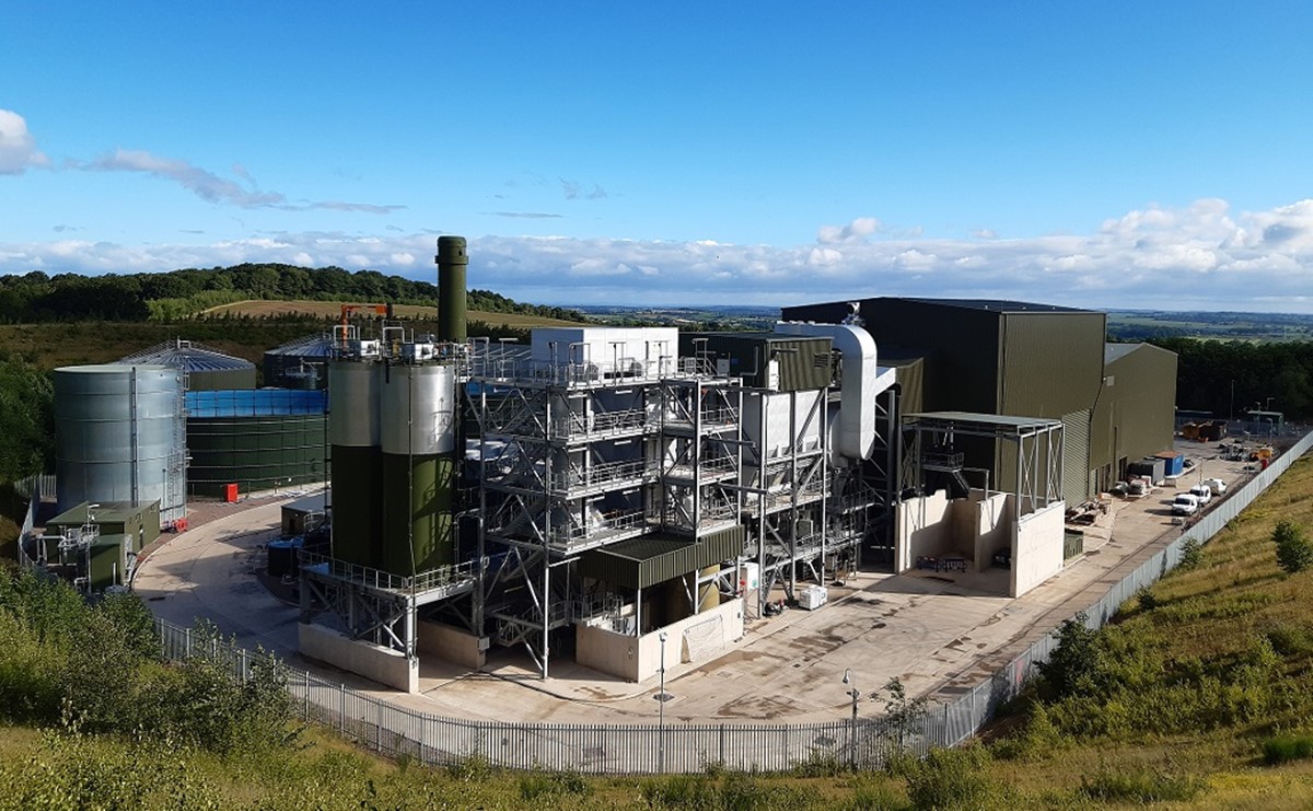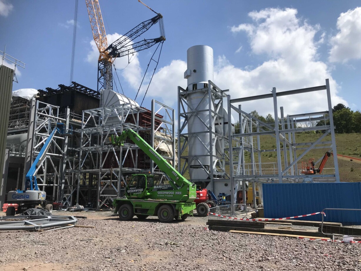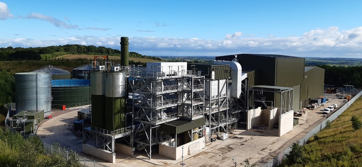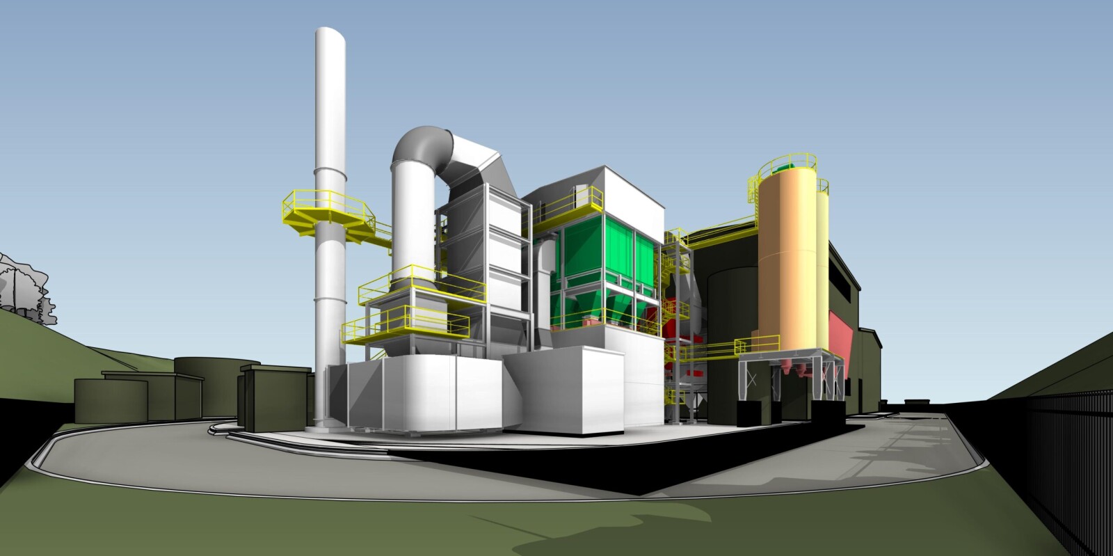including a boiler, turbine, chimney stack, and flue-gas treatment