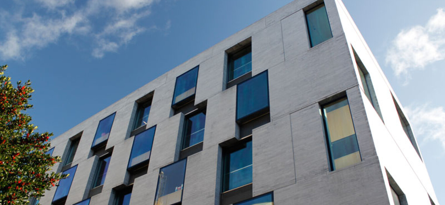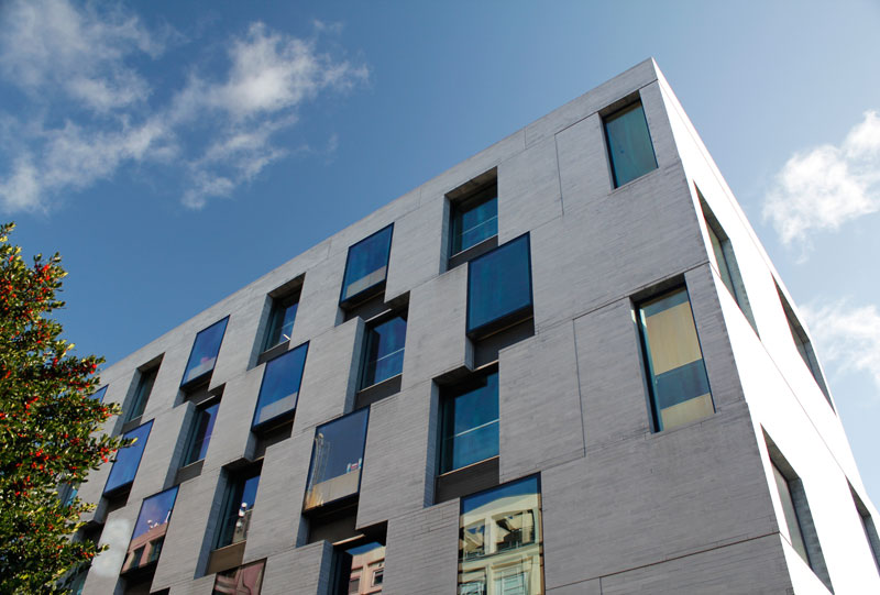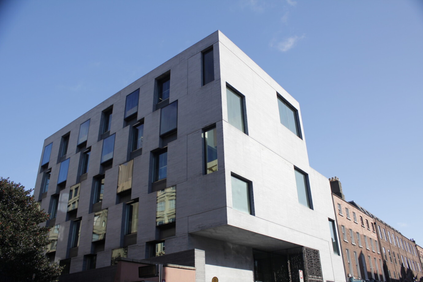 The façade was developed to form a deep stone and glass screen. Windows integrate ‘nostrils’ which breathe in natural air, which is distributed into office spaces and is drawn into the six chimneys placed centrally in the plan. Circulation is placed on the perimeter of the building with offices placed away from the facades. Some notable features apparent in the building’s exterior include the predominant pale coloured Ballinasloe limestone (which is self-supporting and 4 inches in depth) and the darker coloured Carlow/Kilkenny flamed limestone, which can be observed at the side of the building nearest the Huguenot Cemetery. Specially designed bronze railings add visual impact to the building’s entrance, while the distinctive glazing used throughout is also noteworthy.
