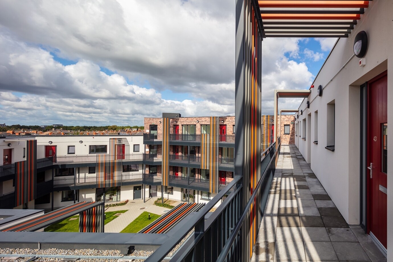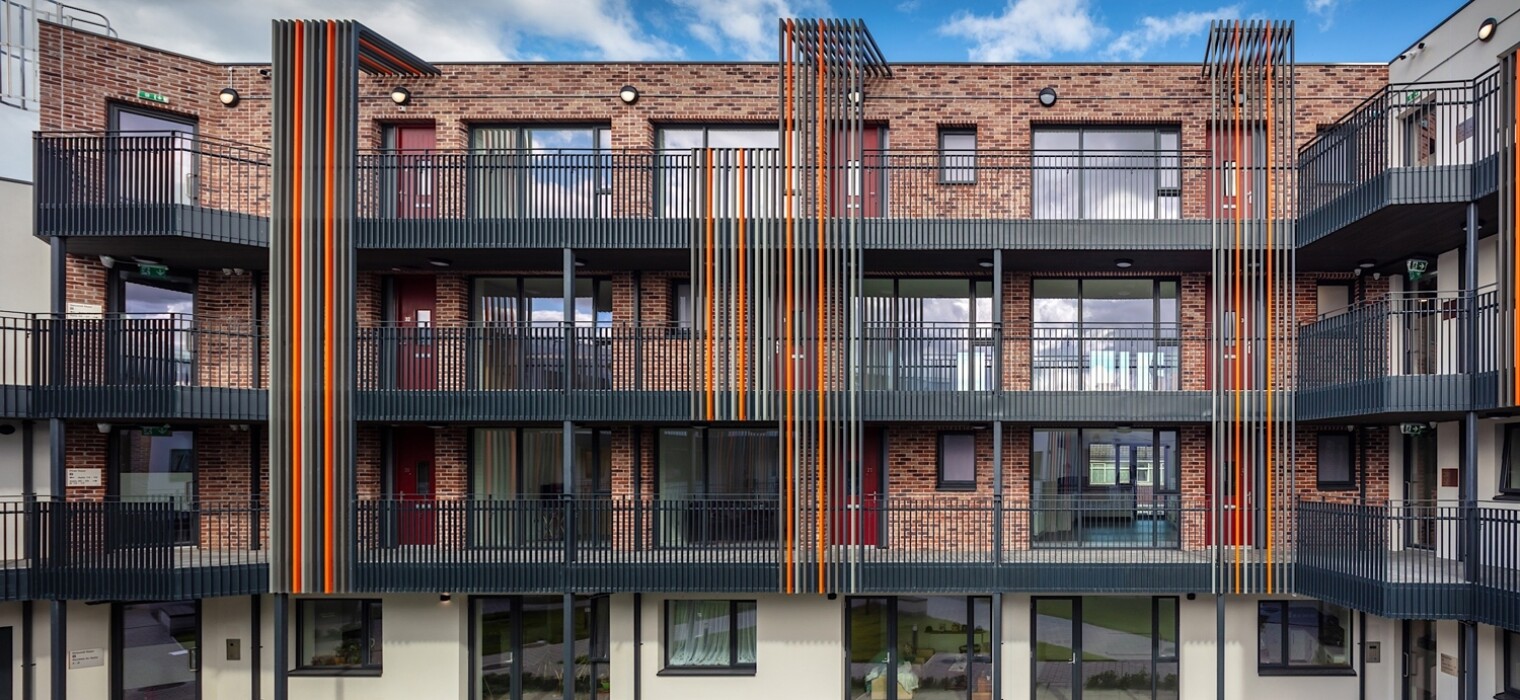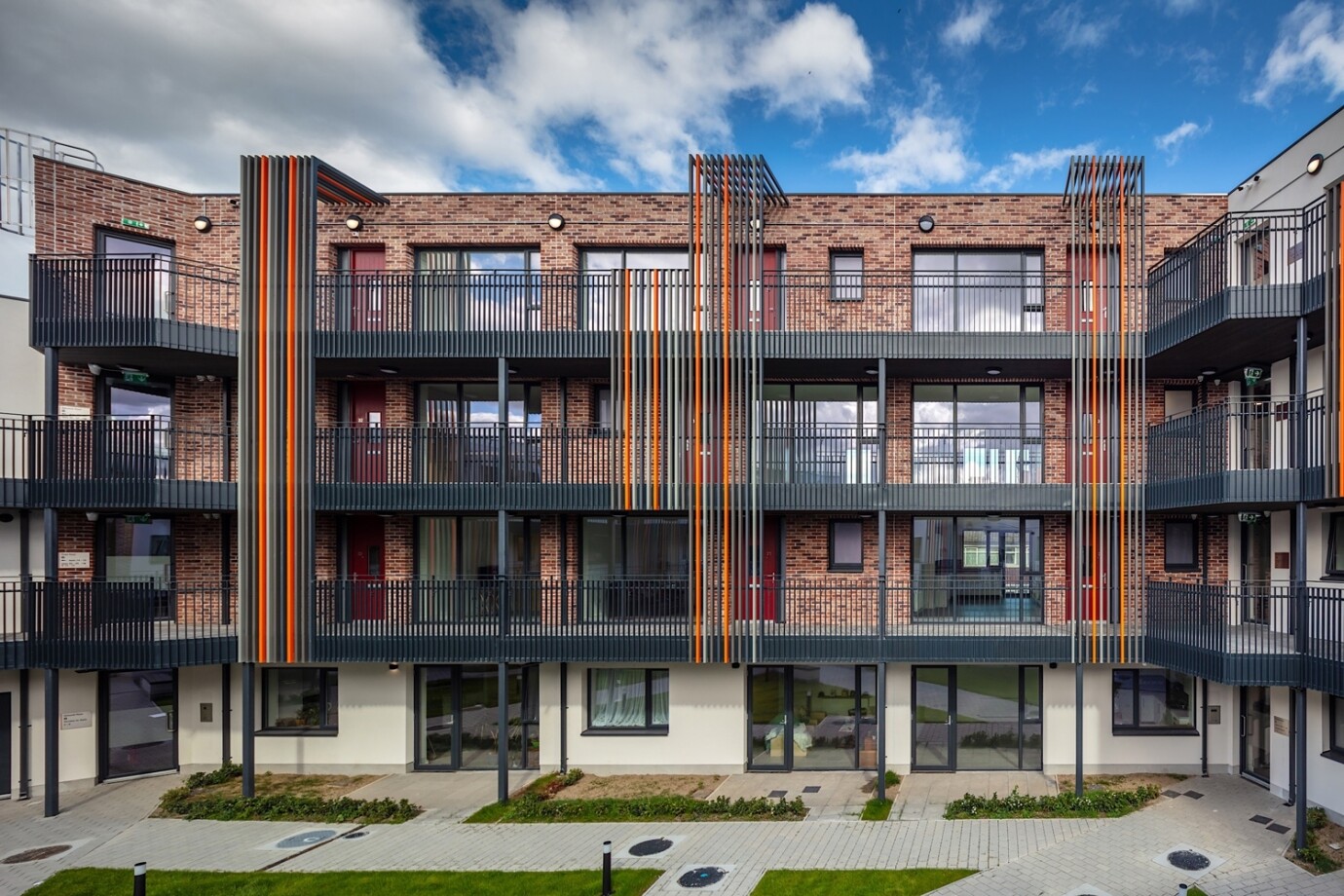 Steel cantilever balconies were used around the external façade of the project, and an internal steel framed walkway provides access on the internal façade around the courtyard from the 2no. cores to the residential units.
