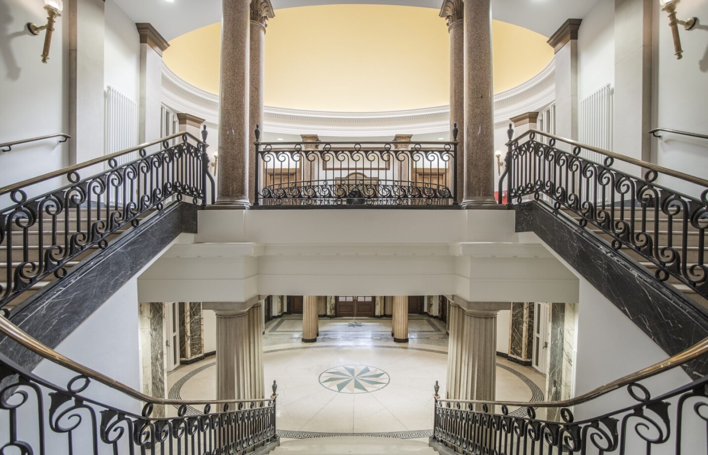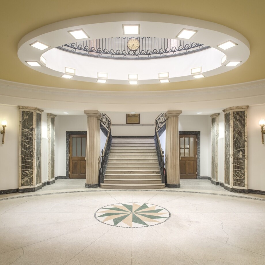 The detail to the external façade and grand entrance ensured its listing by English Heritage. This project involved the careful restoration of the architectural detailing to the triple height entrance foyer.