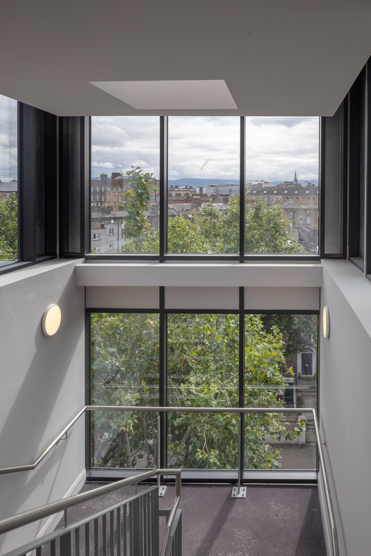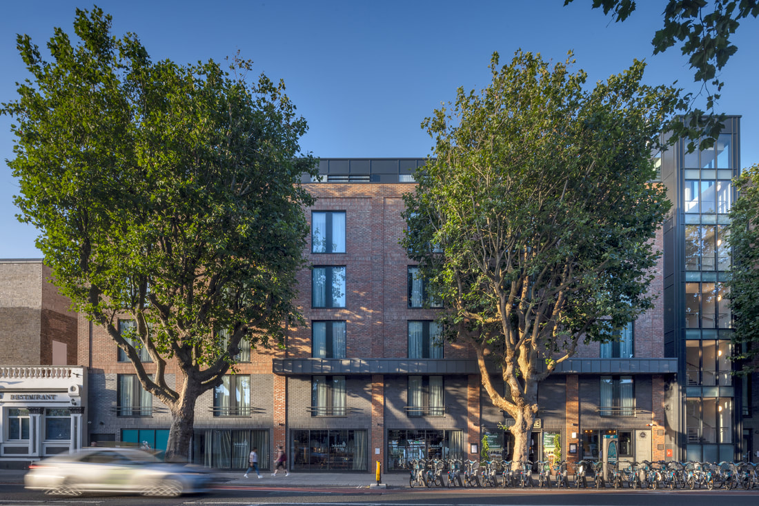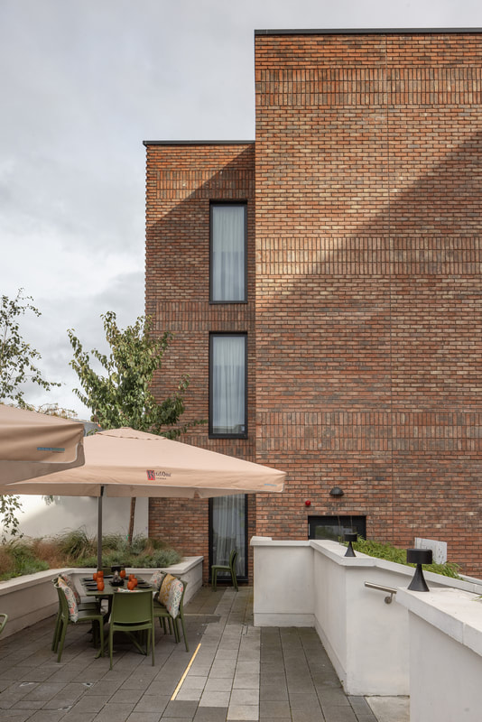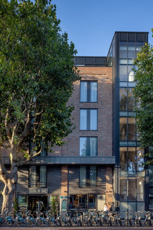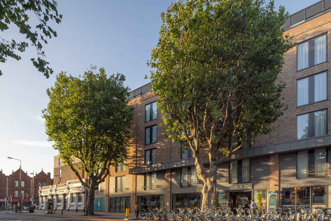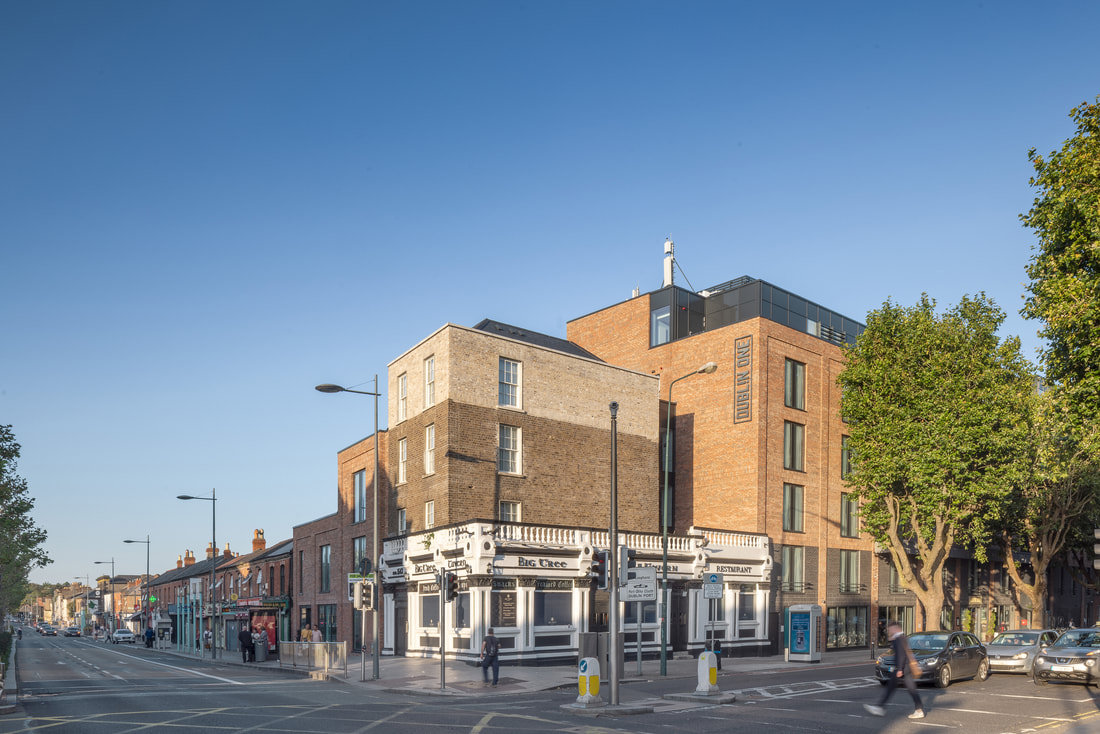 The Dublin One Hotel was opened in 2021. The project involved the restoration of The Big Tree pub which has opened separately to the hotel. The hotel draws on the character of the surrounding historical buildings. It adopts similar materials and window proportions. All windows are vertically proportioned. It is marked out as a modern public building in the adoption of curtain walling for the stairs and setback top storey. The regular layout of hotel rooms has facilitated the breaking up of the long elevation on to North Circular Road into bays. The vertical window proportions and bay width reflect the traditional fine grain development of Dublin. The scale of the building has been further sub-divided vertically by the introduction of a canopy at second floor level and the change of brick colour for the ground and first floor within the bays. This relates directly to the adjoining two storey development.