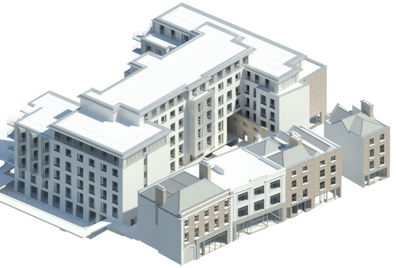 The overall development included a new build 6/7 storey construction within a very confined city centre site. It also involved the refurbishment of five historic buildings which face onto Thomas Street.