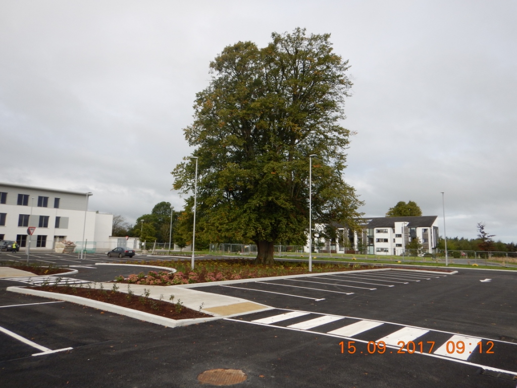 BMCE developed the initial concept design which involved maximising parking numbers within the available lands, coordination with the existing car parking arrangements of an adjacent commercial premises, balancing of cut and fill volumes, provision for future expansion, and protection of existing mature trees on the site. The works involved provision of a new attenuation structure and hydrobrake flow restrictor, new bus stop set-down area, automated exit/entry control barriers, upgrades to the surround public footpath infrastructure, along with new public lighting, future-proofing for EV charging stations, and extensive landscaping works.