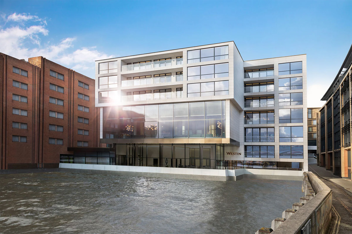 The development also includes a swimming pool and wellness centre, conference facilities, and a restaurant and bar with spectacular views over the River Thames.